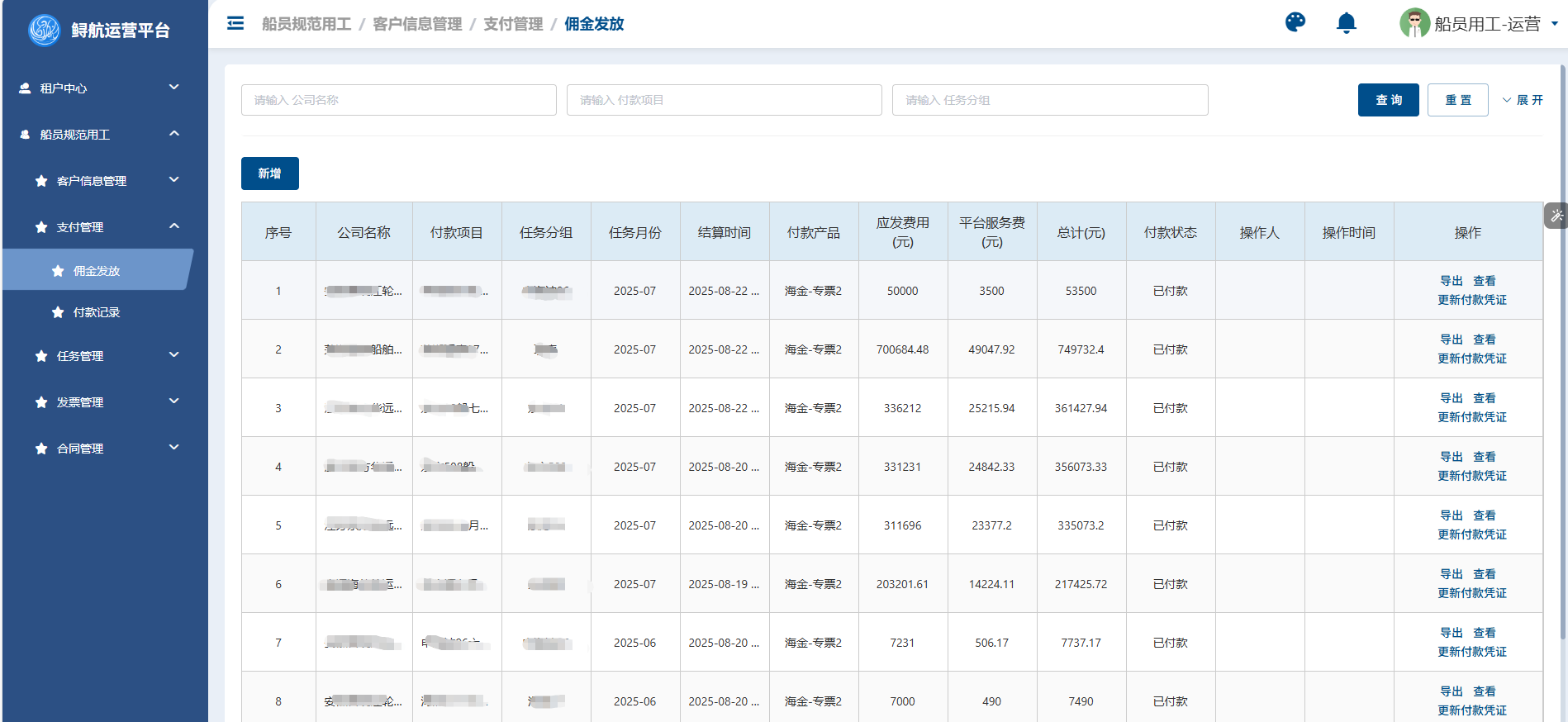 Ⅷ.“鱘航”資金與憑證管理模塊,保證資金透明性的同時確保資金流向與合同及業務數據的一致性。能夠確保基于真實業務數據向船企開具增值稅專用發票/和(或)為船員進行代辦申報,實現“業務-資金-發票(憑證)-納稅”的數據閉環。(見圖10;圖11)