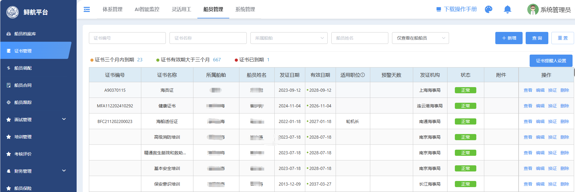 (2)風險預判與應對:專業平臺熟悉船員行業常見風險(如資質造假),可以通過AI風控系統自動篩查異常訂單,例如查詢比對平臺船員證書有效期與任務時間。同時,專業平臺具有航運行業的特殊資質,既可以線下整合船員資源庫(如船員證書資質、特種操作資質等),也可以通過智能算法快速匹配企業需求。