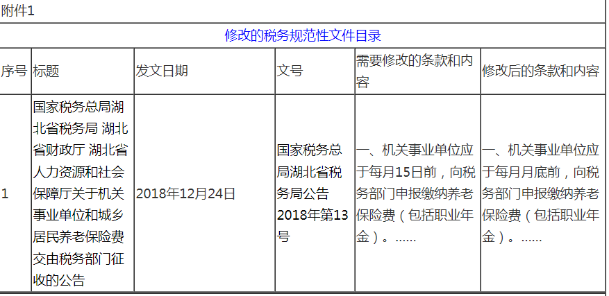 三是部分文件的內(nèi)容與現(xiàn)行規(guī)定不一致。比如《國家稅務(wù)總局湖北省稅務(wù)局 湖北省財政廳 湖北省人力資源和社會保障廳關(guān)于機關(guān)事業(yè)單位和城鄉(xiāng)居民養(yǎng)老保險費交由稅務(wù)部門征收的公告》(2018年第13號)中關(guān)于申報繳納期限的規(guī)定與《國家稅務(wù)總局湖北省稅務(wù)局 湖北省財政廳 湖北省人力資源和社會保障廳 中國人民銀行湖北省分行 湖北省醫(yī)療保障局關(guān)于優(yōu)化調(diào)整社會保險費申報繳納流程的公告》(2024年第2號)規(guī)定不一致,對相應(yīng)條款進行了修改。