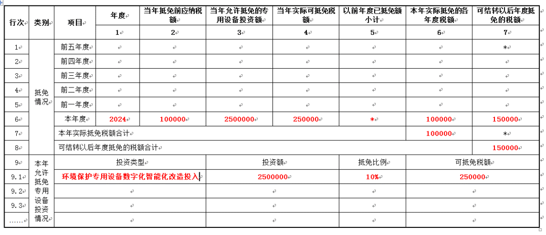 下面通過一個例子來看看企業2024年度發生的專用設備改造支出如何填報新版《稅額抵免優惠明細表》(A107050)吧!