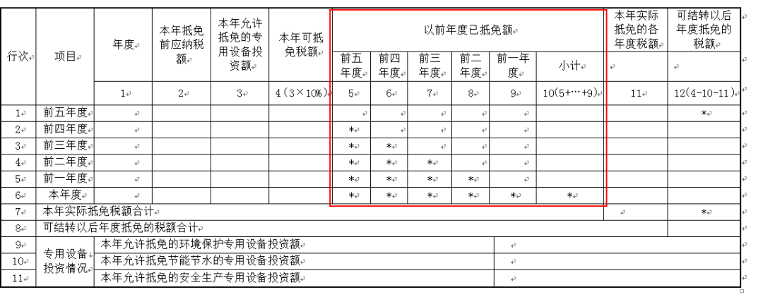 ①舊《稅額抵免優惠明細表》中,“以前年度已抵免額”分為6列,第5列至第9列填報納稅人以前5個年度的已抵免稅額情況,第10列“以前年度已抵免額—小計”填報以前年度已抵免稅額的合計金額。