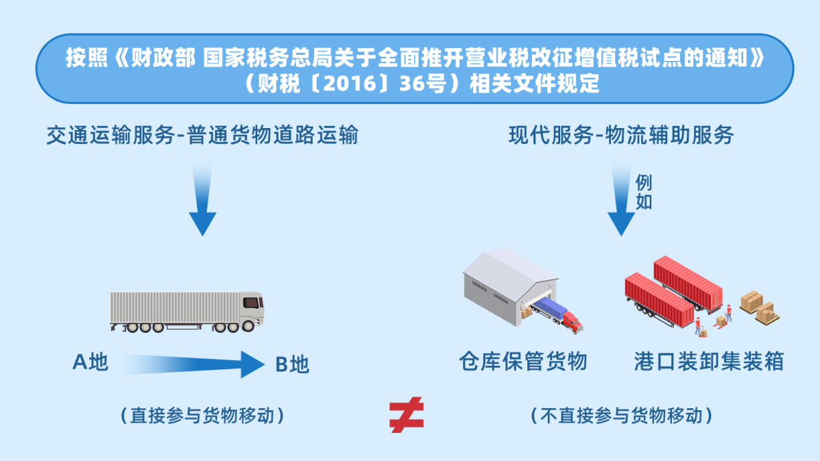 按照《財(cái)政部 國(guó)家稅務(wù)總局關(guān)于全面推開(kāi)營(yíng)業(yè)稅改征增值稅試點(diǎn)的通知》(財(cái)稅〔2016〕36號(hào))相關(guān)文件規(guī)定,“交通運(yùn)輸服務(wù)”是指利用運(yùn)輸工具(如卡車、飛機(jī)、輪船等)將貨物或旅客送達(dá)目的地,使其空間位置得到轉(zhuǎn)移的業(yè)務(wù)活動(dòng)。而“物流輔助服務(wù)”中包含的項(xiàng)目則通常指為運(yùn)輸過(guò)程提供支持、但不直接參與貨物移動(dòng)的服務(wù)(如倉(cāng)庫(kù)保管貨物、港口裝卸集裝箱等),屬于“現(xiàn)代服務(wù)”范疇。