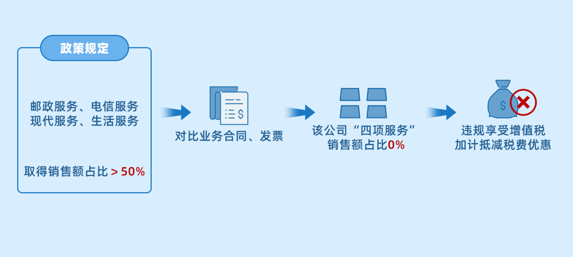 檢查組迅速與破產(chǎn)管理人取得聯(lián)系,在將破產(chǎn)管理人提供的業(yè)務(wù)合同等關(guān)鍵資料與稅務(wù)系統(tǒng)顯示的該公司發(fā)票開(kāi)具情況進(jìn)行細(xì)致比對(duì)分析后,證據(jù)鏈清晰顯示:該公司檢查所屬期內(nèi)全部銷售收入均來(lái)源于交通運(yùn)輸服務(wù),而現(xiàn)代服務(wù)-物流輔助服務(wù)銷售額占比為0%。