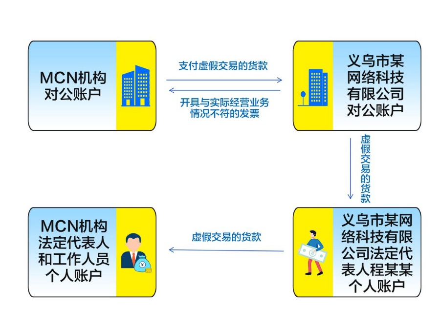 原來,該MCN機構法定代表人張旭陽和義烏市某網絡科技有限公司法定代表人程某某早有勾結,而雙方公司交易平臺虛擬幣的業務既有真實的,也有虛假的。真實業務是該MCN機構向義烏市某網絡科技有限公司購買平臺虛擬幣,通過銀行賬戶支付款項,義烏市某網絡科技有限公司開具銷售發票。在虛假交易中,該MCN機構要求對方為自己開具與實際經營業務情況不符的發票并支付貨款。貨款到達義烏市某網絡科技有限公司對公賬戶后,程某某再轉至自己個人賬戶,然后通過銀行轉賬打到張旭陽和該MCN機構工作人員的個人賬戶中,最終形成了資金“回流”閉環。