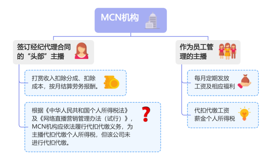 根據《中華人民共和國個人所得稅法》及《網絡直播營銷管理辦法(試行)》,該MCN公司與主播簽訂了經紀代理合同,與主播之間建立了勞務合同關系,在與主播結算勞務報酬的同時,MCN機構應為主播預扣預繳“勞務報酬所得”個人所得稅。