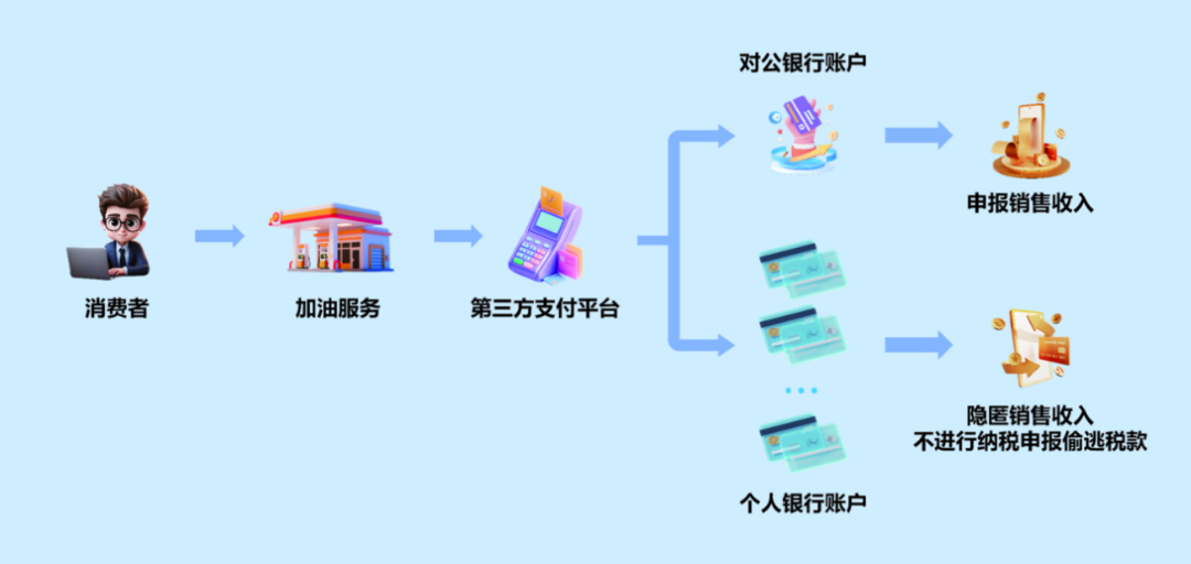 經(jīng)過(guò)比對(duì),發(fā)現(xiàn)上述收銀憑證所記載的收銀信息與該加油站的對(duì)公賬戶銀行流水記錄不符。檢查人員隨即圍繞這一關(guān)鍵疑點(diǎn)深入核查,逐步鎖定關(guān)聯(lián)證據(jù),形成了完整的證據(jù)鏈。最終成功還原了案件的事實(shí)與真相:該加油站通過(guò)在第三方收款平臺(tái),綁定個(gè)人賬戶接收加油款項(xiàng),以此規(guī)避對(duì)公賬戶核算,試圖掩蓋真實(shí)銷售數(shù)據(jù),形成了一條隱蔽的賬外收款鏈條。
