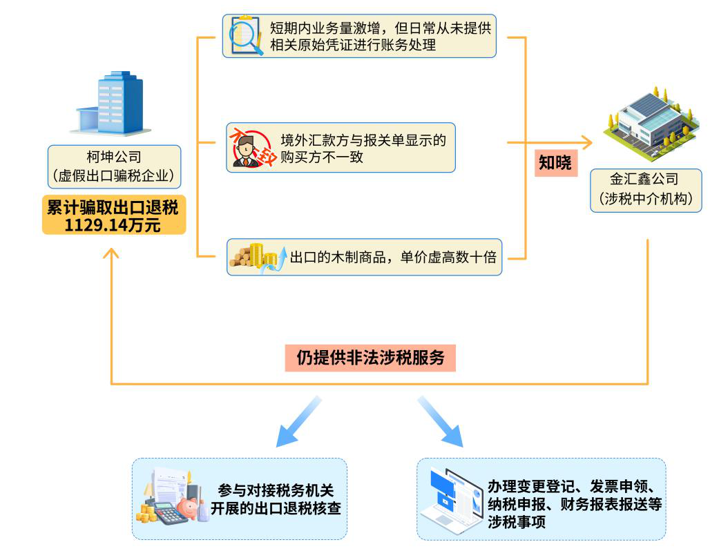 經查實,柯坤公司在2023年8月至2024年4月期間共計騙取出口退稅1129.14萬元,金匯鑫公司自2023年8月起為柯坤公司提供代理記賬等涉稅服務。金匯鑫公司及其實際控制人賴昌鍛、法定代表人陳龍在明知柯坤公司實施騙取出口退稅違法犯罪的情況下,不僅未履行法定的監督、報告義務,卻選擇了放任自流,成為騙稅分子的幫兇,最終導致了國家出口退稅款的流失。