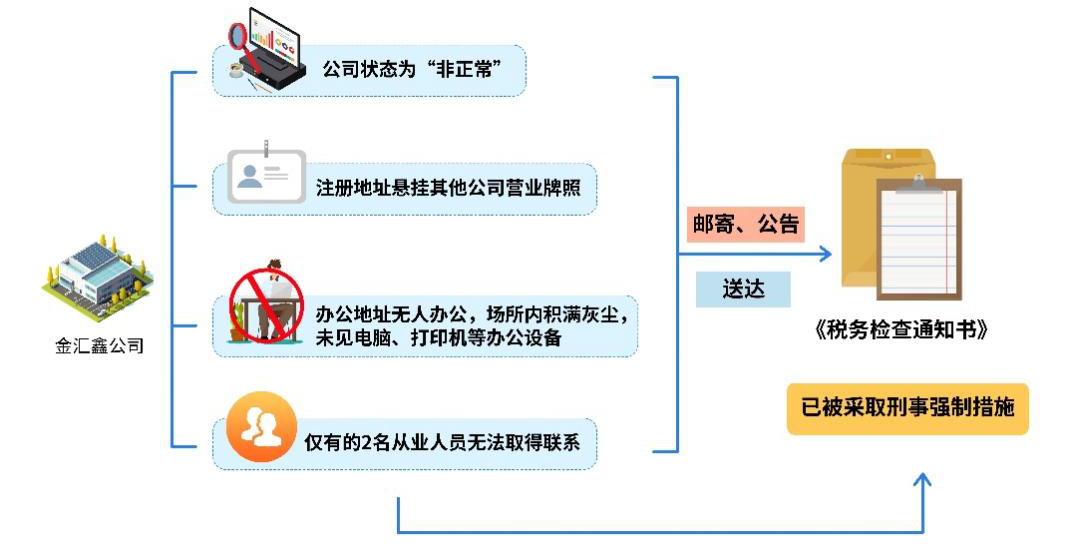 實地走訪無果后,檢查人員多次電話聯系陳龍和賴昌鍛,均無法取得聯系。檢查人員依法采取郵寄和公告方式向該公司送達了《稅務檢查通知書》。隨后,經公安機關告知,檢查人員得知賴昌鍛、陳龍兩人因涉“柯坤公司騙稅案”已被采取刑事強制措施。