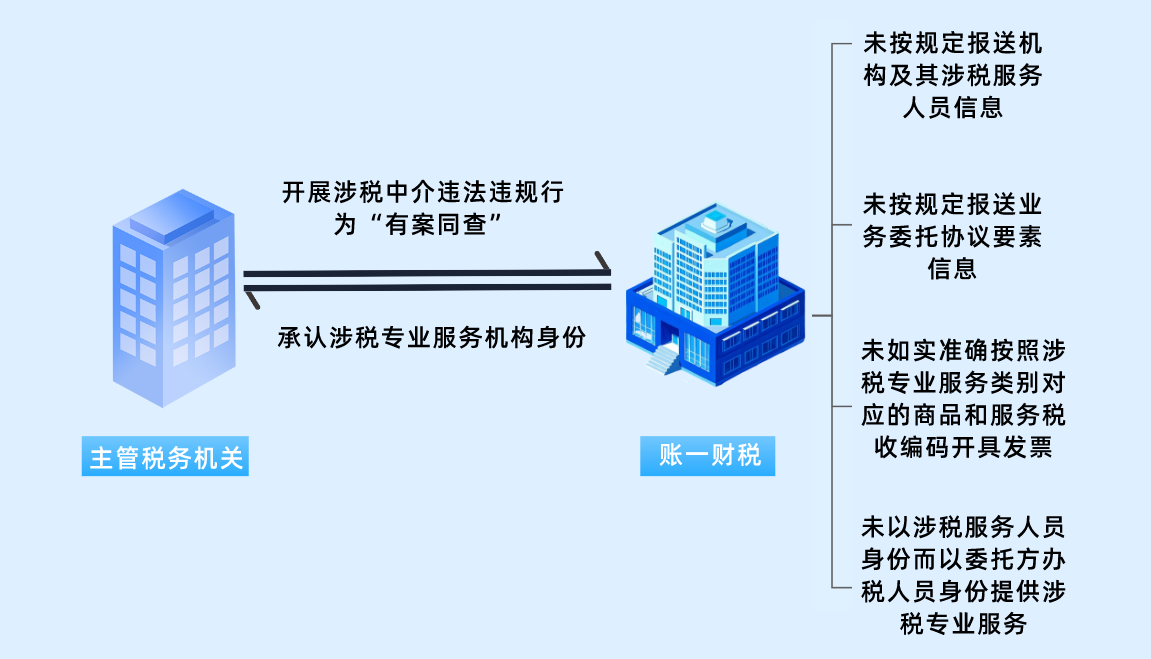 同時,賬一財(cái)稅的主管稅務(wù)機(jī)關(guān)——國家稅務(wù)總局上海市奉賢區(qū)稅務(wù)局接到其違法違規(guī)的相關(guān)線索后,同步開展涉稅中介違法違規(guī)行為“有案同查”。經(jīng)核實(shí),賬一財(cái)稅未向稅務(wù)機(jī)關(guān)報送機(jī)構(gòu)信息,不在納入監(jiān)管的涉稅專業(yè)服務(wù)機(jī)構(gòu)名單內(nèi),可能存在逃避行政監(jiān)管的行為。