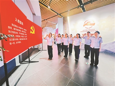 ▲圖為沈陽市沈河區稅務局干部到沈陽市博物館參觀“豐碑——中國共產黨領導東北抗戰歷史貢獻主題展”,并重溫入黨誓詞。