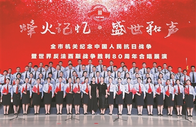 ▲圖為山東省棗莊市稅務局干部參加全市機關紀念中國人民抗日戰爭暨世界反法西斯戰爭勝利80周年合唱展演。