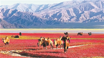 秋季,在青海省海西蒙古族藏族自治州烏蘭縣,都蘭湖國家濕地公園岸邊的鹽生植物鹽爪爪染紅了大地,似一塊巨大的紅地毯,與藍天、白云、高山交相輝映,和前來覓食的駱駝一起,形成了一幅色彩斑斕的油畫。都蘭湖國家濕地公園水源充足、牧草茂盛,是野生動物理想的棲息地,國家重點保護動物黑頸鶴、斑頭雁、鵝喉羚等許多動物在此繁衍生息,是青藏高原濕地原生態系統的典型代表。 近年來,烏蘭縣采取封灘、育林、育草、減畜等措施加強濕地的保護和利用。當地稅務部門發揮綠色稅制正向激勵作用,鼓勵企業加大節能環保投入,減少污染物排放,守護高原濕地。同時,深化與自然資源等部門的溝通聯系,完善信息共享機制,共同構建生態保護工作格局。