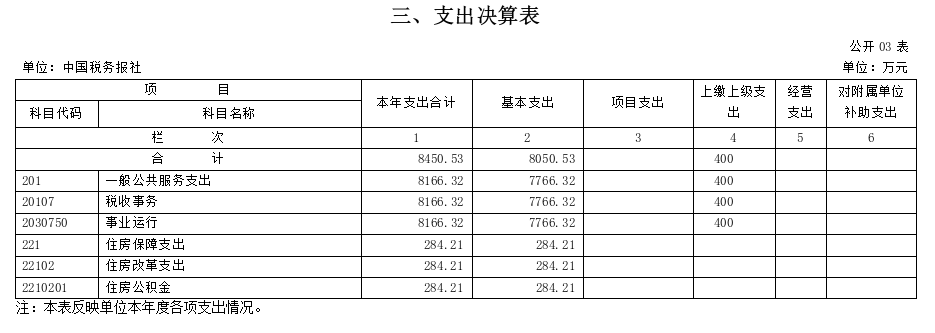 中國稅務報社2024年度支出總計11093.15萬元,其中本年支出8450.53萬元,支出具體情況如下: