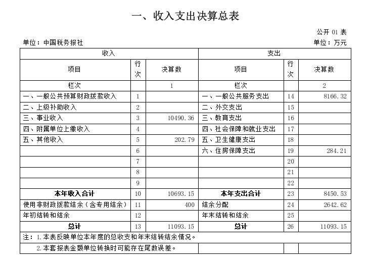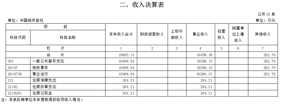 2024年度,中國稅務報社本年收入合計10693.15萬元。其中:事業收入10490.36萬元,占本年收入的98.1%;其他收入202.79萬元,占本年收入的1.9%。