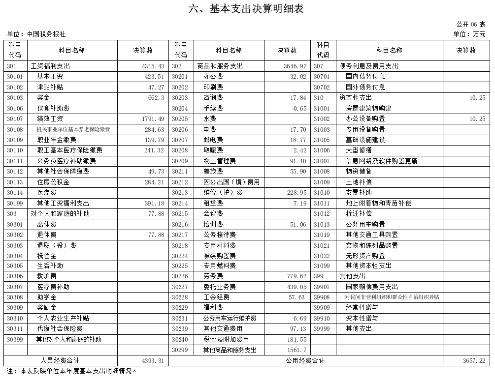 中國稅務報社2024年度基本支出8050.53萬元,主要用于保障機構正常運行、完成日常工作任務而發生的各項支出。其中: