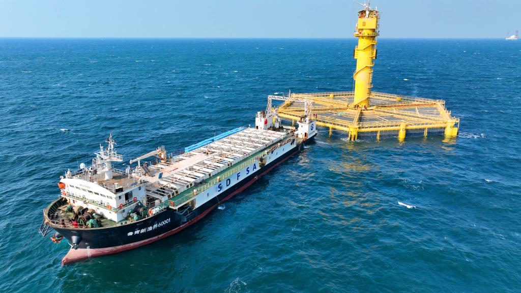 “三文魚的養殖環境要求很高,找到一片適合的區域大規模養殖十分困難。但在我們腳下海域深處有一片13萬平方公里的黃海冷水團,夏季水溫在10至16攝氏度,非常適合三文魚生長。”同行的山東財金萬澤豐海洋科技有限公司生產負責人顧祺煥說,“深藍2號”夏天下沉到30米以下冷水團位置,冬天再上升到水面,巧妙利用了這一大自然的“饋贈”,實現了我國在溫暖海域養殖冷水魚類的突破。