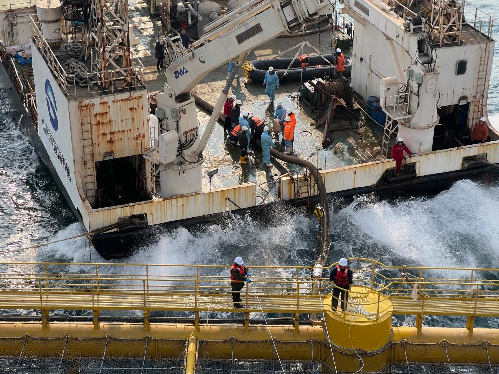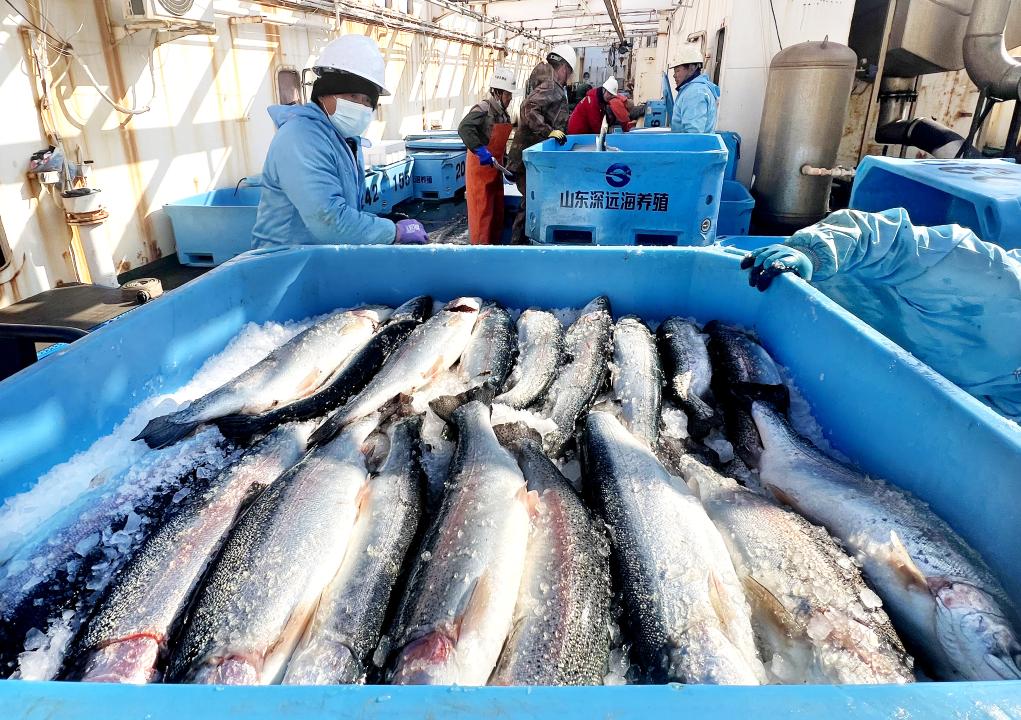 圖為青島國家深遠海綠色養殖試驗區內三文魚收獲場景。新華社記者李紫恒 攝