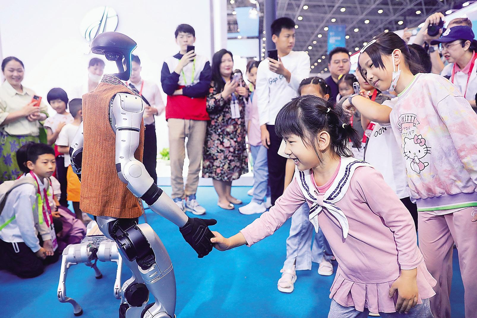 在消博會1號館“智啟新紀元·人工智能展”專區,一名小朋友與人形機器人互動。