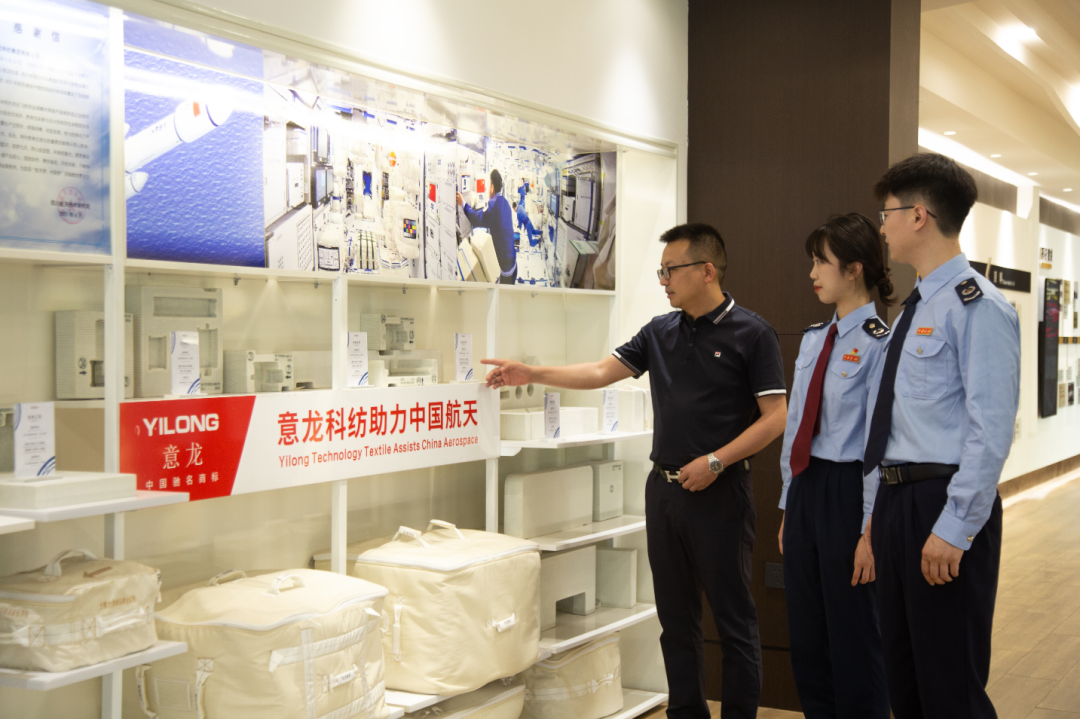 在四川意龍科紡集團(tuán)股份有限公司產(chǎn)品展廳,工作人員向稅務(wù)干部介紹公司參與研發(fā)的航天專用包覆面料。張?zhí)燹?攝