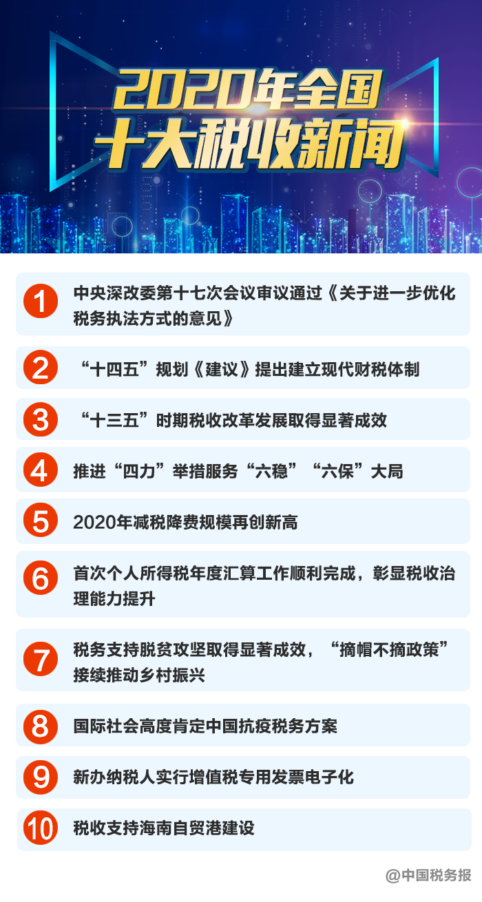 從2020年十大稅收新聞看,稅收工作全面嵌入統籌推進疫情防控和經濟社會發展的基本策略是打好改革和政策“組合拳”。