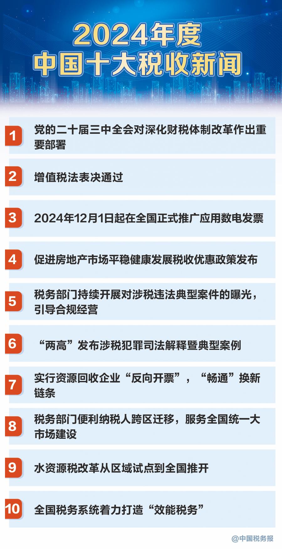 2024年中國十大稅收新聞,印證了我國2024年稅收領域發生的重大事件和取得的重要成績,也體現了“正向引導、提振信心、改善預期”的稅務行動。